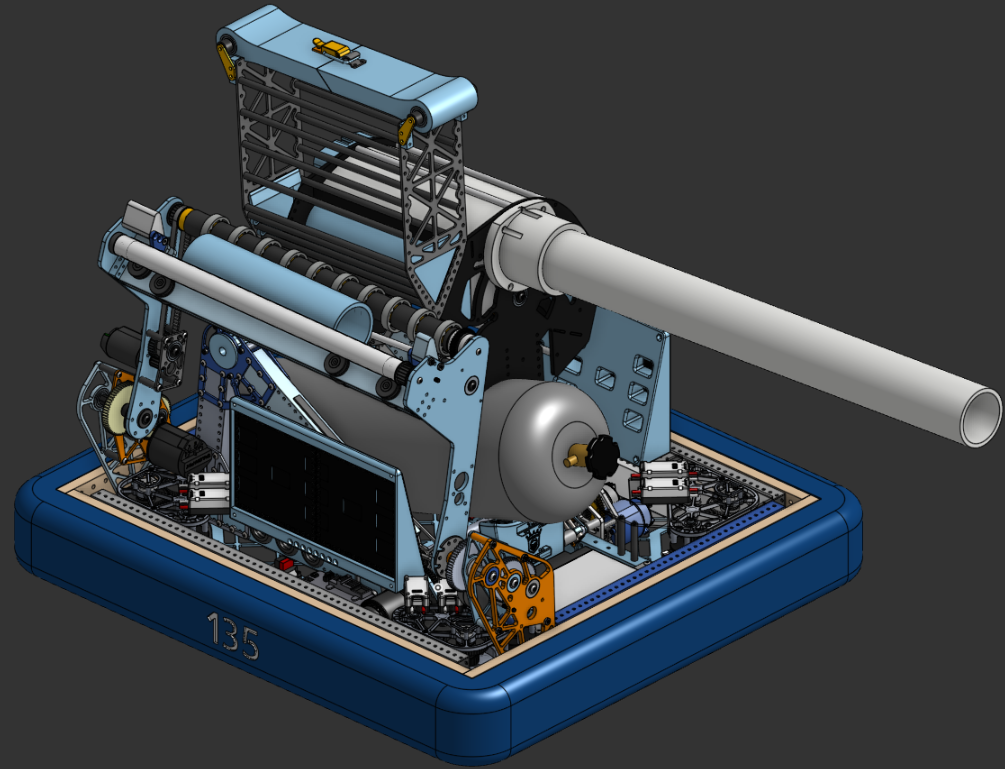 Back in May/June, our team floated the idea of a new T-shirt cannon. We had one before: it was a lot of questionable material choices, and if you dig up this Chief Delphi thread, you’ll see why people called it a bad idea. Our younger selves were optimistic… maybe a little too optimistic with using PVC in places it shouldn't be, but hey--we learned. We then had a secondary one, one developed with safety in mind, but it wasn't designed to do pivot up, store more than one burst of shots, or anything.