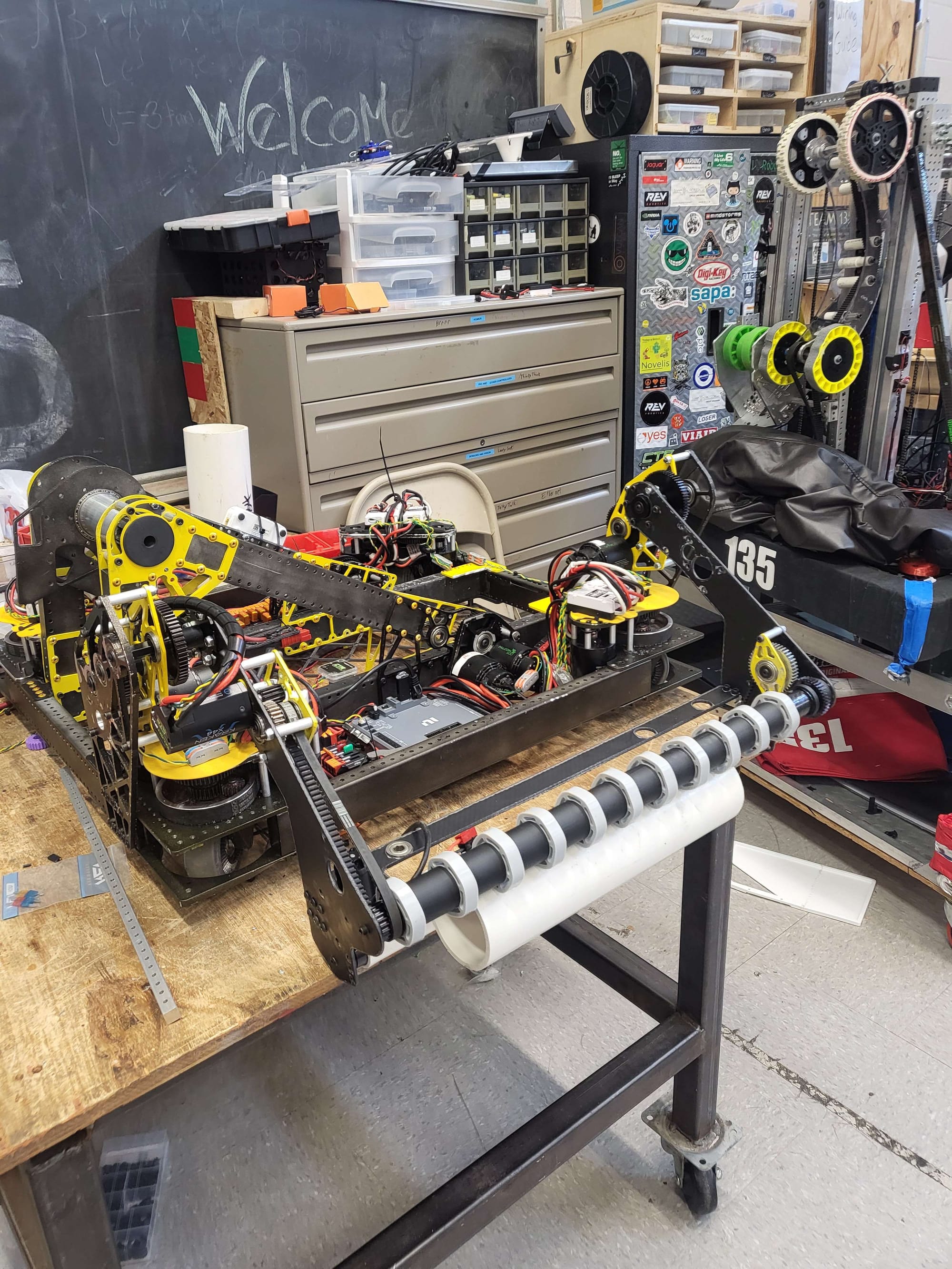 By September, the barrel tubes were cut, mounts were fabbed, and the frame started to look like a real robot, not just a chassis.