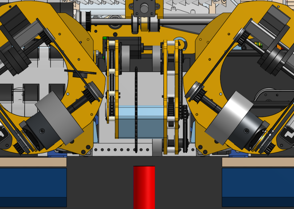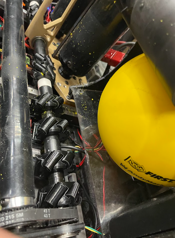 At the center of the new design, we implemented an enter splitter to better control initial ball placement. Rather than driving a strict V-index configuration, we transitioned to a passive guide that directs balls toward the turret side, reducing unnecessary lateral force. We also added more 3D printed mecanum wheels to create smoother transfer paths with varying overall diameters. Finally, we refined and smoothed the Lexan edges to eliminate sharp transitions that previously contributed to ball damage and jamming.